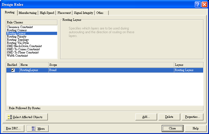 因列舉電路不是很複雜關(guān)系,所以我們用單面版就可以布線完成,而通常PROTEL里預(yù)設(shè)版面是以雙面來進(jìn)行布線,所以我們要選擇成單面布線。選擇上方主目錄中Design→Rules出現(xiàn)對(duì)話框后,選到Routing Layers后,進(jìn)入右下角的設(shè)定Properties,如圖18。